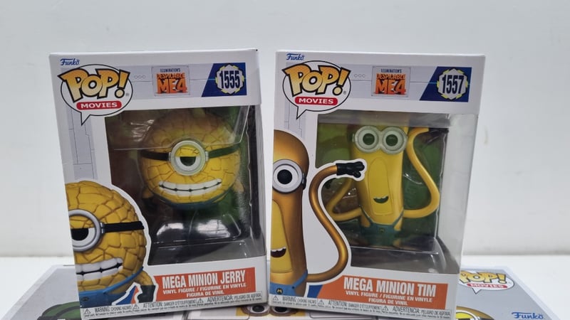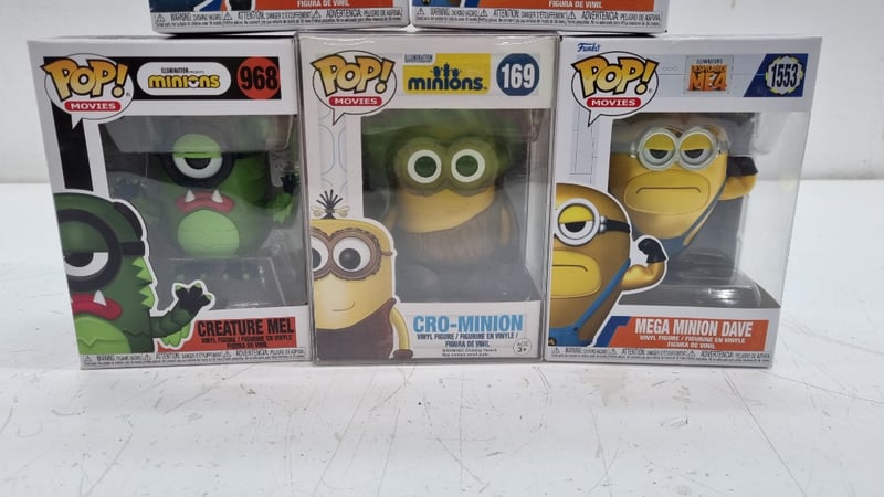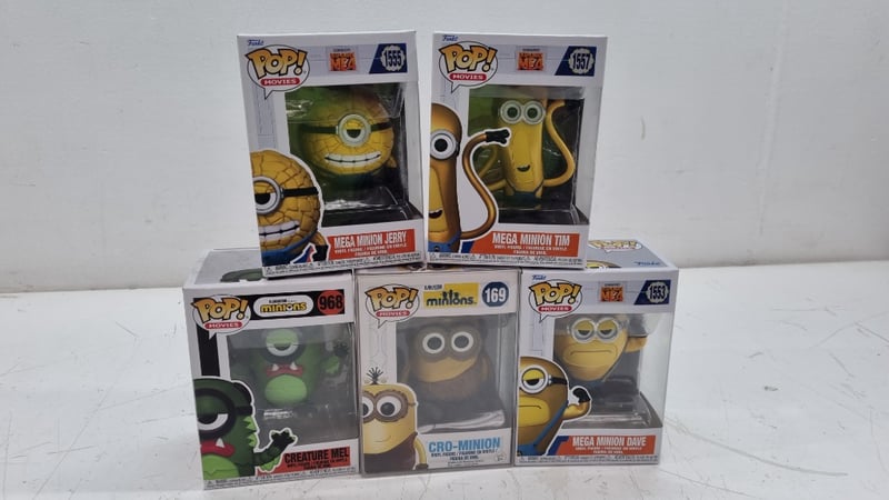 Comprehensive Collection Of Six Funko Pop Vinyl Figures From The Minions And Despicable Me Franchise, Featuring Mega Minion Jerry (#1555), Mega Minion Tim (#1557), Mega Minion Dave (#1553), Cro-Minion (#169), And Creature Mel (#968). Each Figure Is Housed In Original Factory Packaging With Printed Character Artwork And Identification Numbers. The Set Showcases The Distinctive Yellow Minion Characters With Characteristic Oversized Eyes And Expressive Features, Rendered In Funko'S Signature Stylis