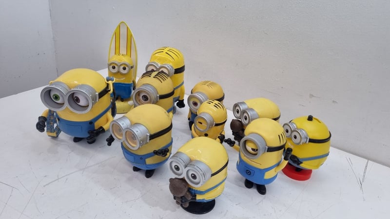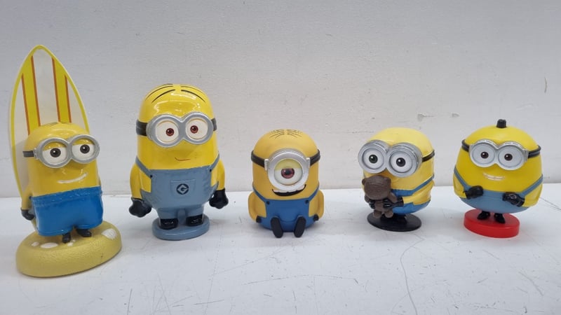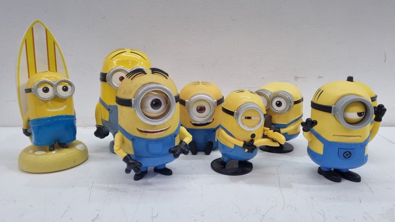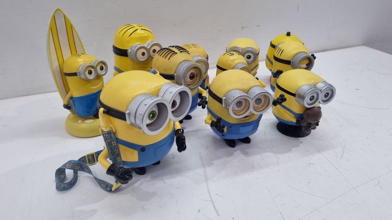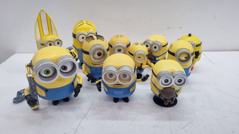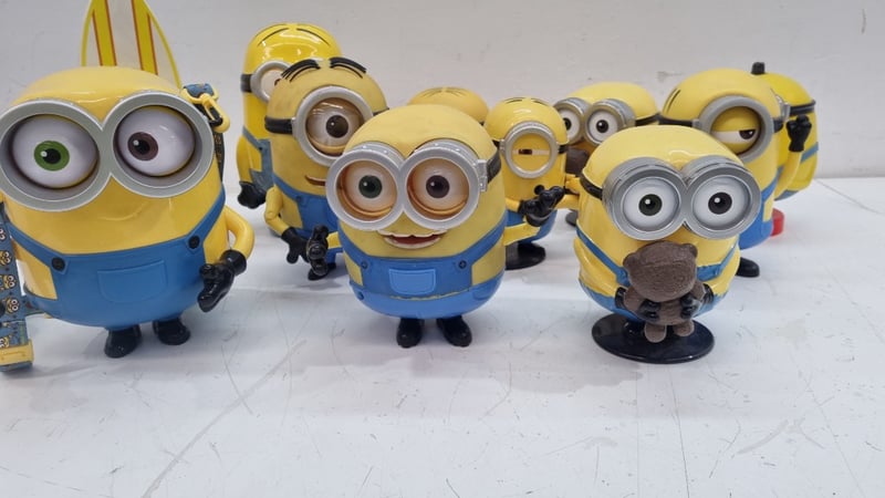 MINIONS CHARACTER COLLECTIBLE FIGURES SET - DESPICABLE ME MERCHANDISE Item Size: Height: 25cm, Width: 10cm, Depth: 10cm Collection Of Eight Minions Character Figurines From Despicable Me Franchise, Featuring Various Character Types Including Two-Eyed And One-Eyed Variants. Includes Surfboard-Wielding Minion, Standard Minions In Blue Overalls With Yellow Bodies, And Specialty Characters With Brown Hair/Accessories. Figures Display Articulated Details With Painted Eyes, Black Stripes, And Individual Personality Characteristics. One Figure Features Red Base Platform. Includes Fabric Lanyard With Minion Branding. Condition: Good - Refer To Images 548682+7