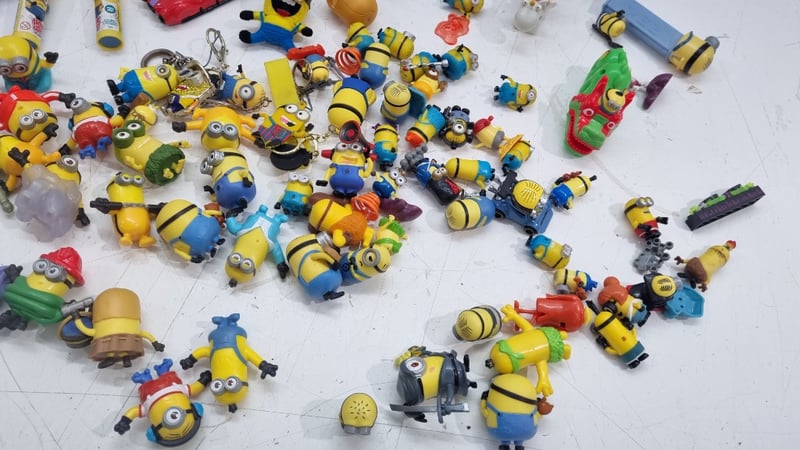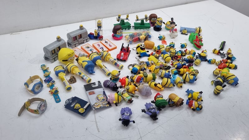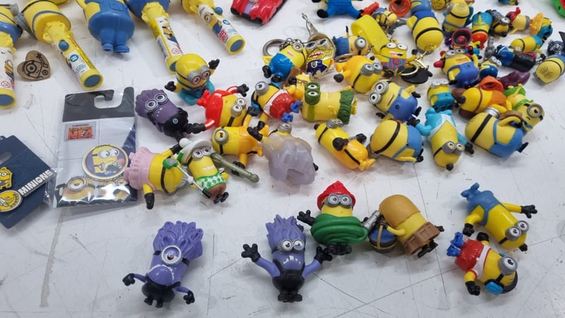 Comprehensive Collection Of Minions-Themed Toys And Merchandise From The Despicable Me Franchise, Including Articulated Figurines, Character Vehicles, Wristwatches, , Keychains, And Miscellaneous Accessories. Items Feature Various Minion Characters In Yellow And Blue Coloring, Alongside Supporting Charactersand Villain Figures. Collection Includes Mechanical Toys, Plush Elements, Plastic Construction Vehicles, And Branded Packaging Materials. Pieces Range From Small Keychain Dimensions To Larger