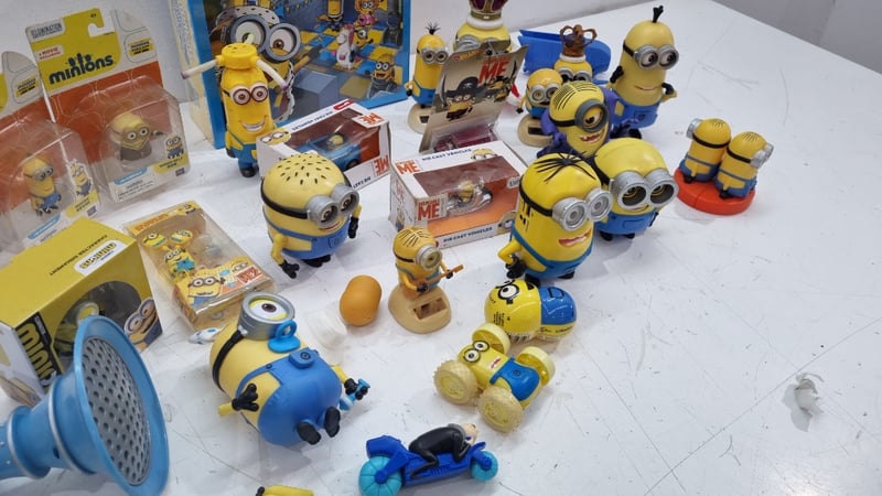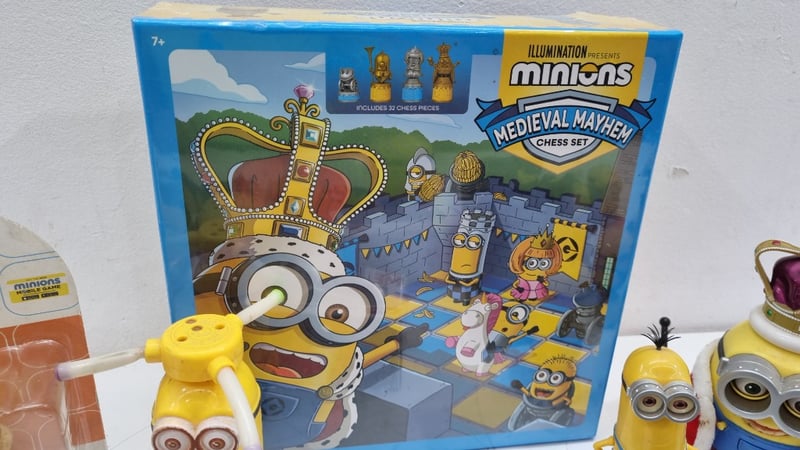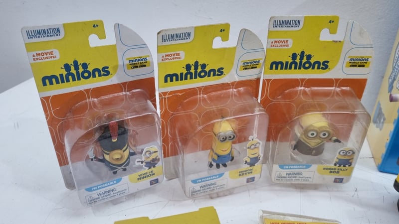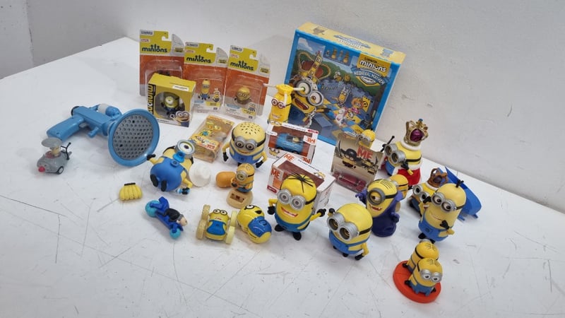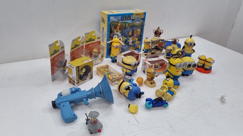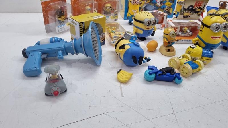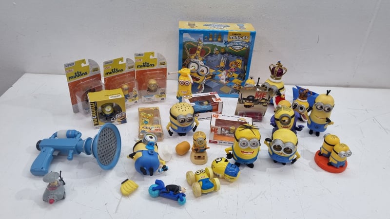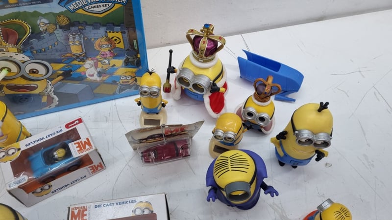 EXTENSIVE MINIONS TOY COLLECTION - ILLUMINATION ENTERTAINMENT MERCHANDISE Comprehensive Collection Of Minions-Themed Toys And Collectibles From Illumination Entertainment, Featuring 30+ Individual Figures, Action Toys, Includes Articulated Minion Characters In Various Poses, A Medieval Mayhem Chess Set (7+ Years), Movie-Exclusive Character Sets, Die-Cast Vehicle, A Blue Projection Gun, Wooden Puzzle Pieces, And Multiple Packaged Minion Figurines. Collection Encompasses Both Loose Figures And Original Packaging Condition: Good - Refer To Images 548682+9