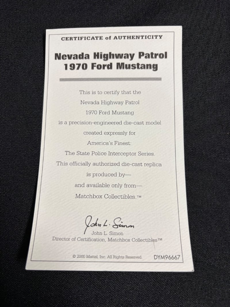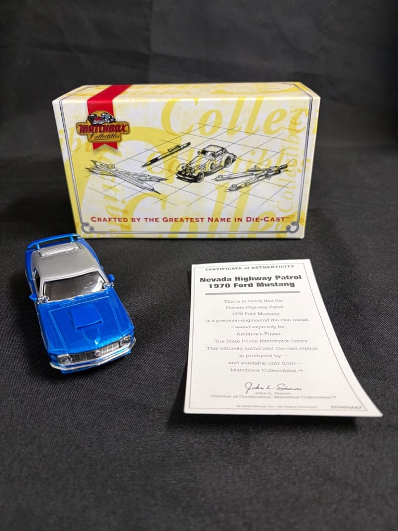 MATCHBOX COLLECTIBLES NEVADA HIGHWAY PATROL 1970 FORD MUSTANG DIE-CAST MODEL WITH CERTIFICATE OF AUTHENTICITY Item Size: Height: 5cm, Width: 3cm, Depth: 10cm, Weight: 0.5Kg Condition: Good - Refer To Images 584552+15