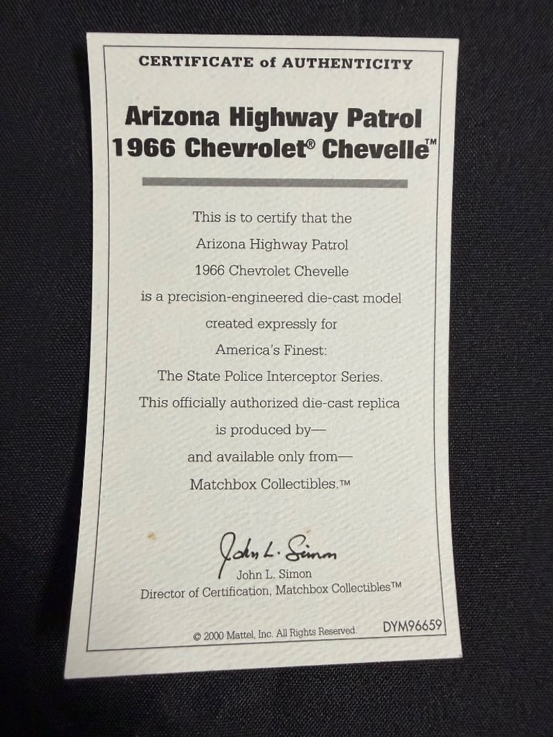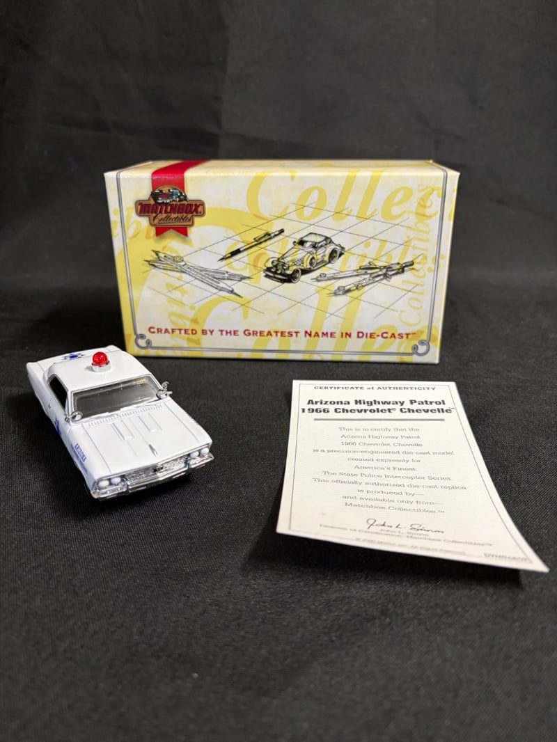 MATCHBOX COLLECTIBLES ARIZONA HIGHWAY PATROL 1966 CHEVROLET CHEVELLE DIE-CAST MODEL WITH CERTIFICATE OF AUTHENTICITY Item Size: Height: 5cm, Width: 3cm, Depth: 10cm, Weight: 0.5Kg Condition: Good - Refer To Images 584552+18