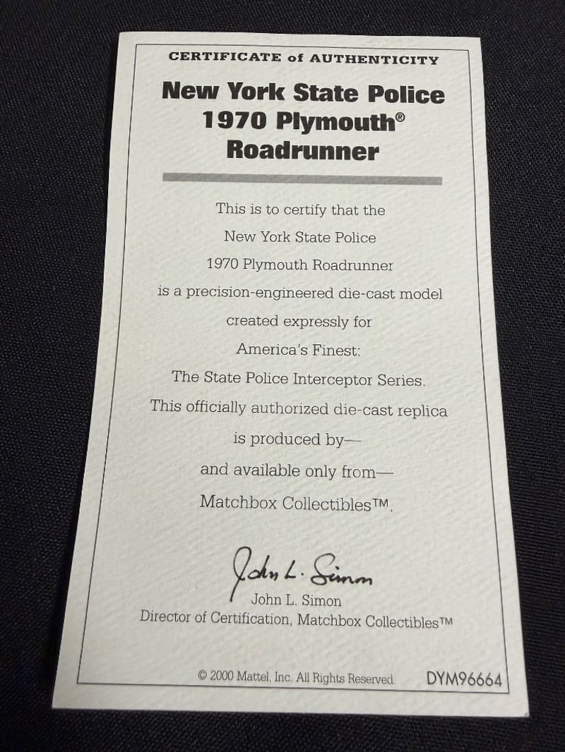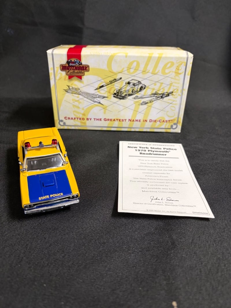 MATCHBOX COLLECTIBLES NEW YORK STATE POLICE 1970 PLYMOUTH ROADRUNNER - CERTIFIED DIE-CAST MODEL Item Size: Height: 5cm, Width: 3cm, Depth: 10cm, Weight: 0.5Kg Condition: Good - Refer To Images 584552+21
