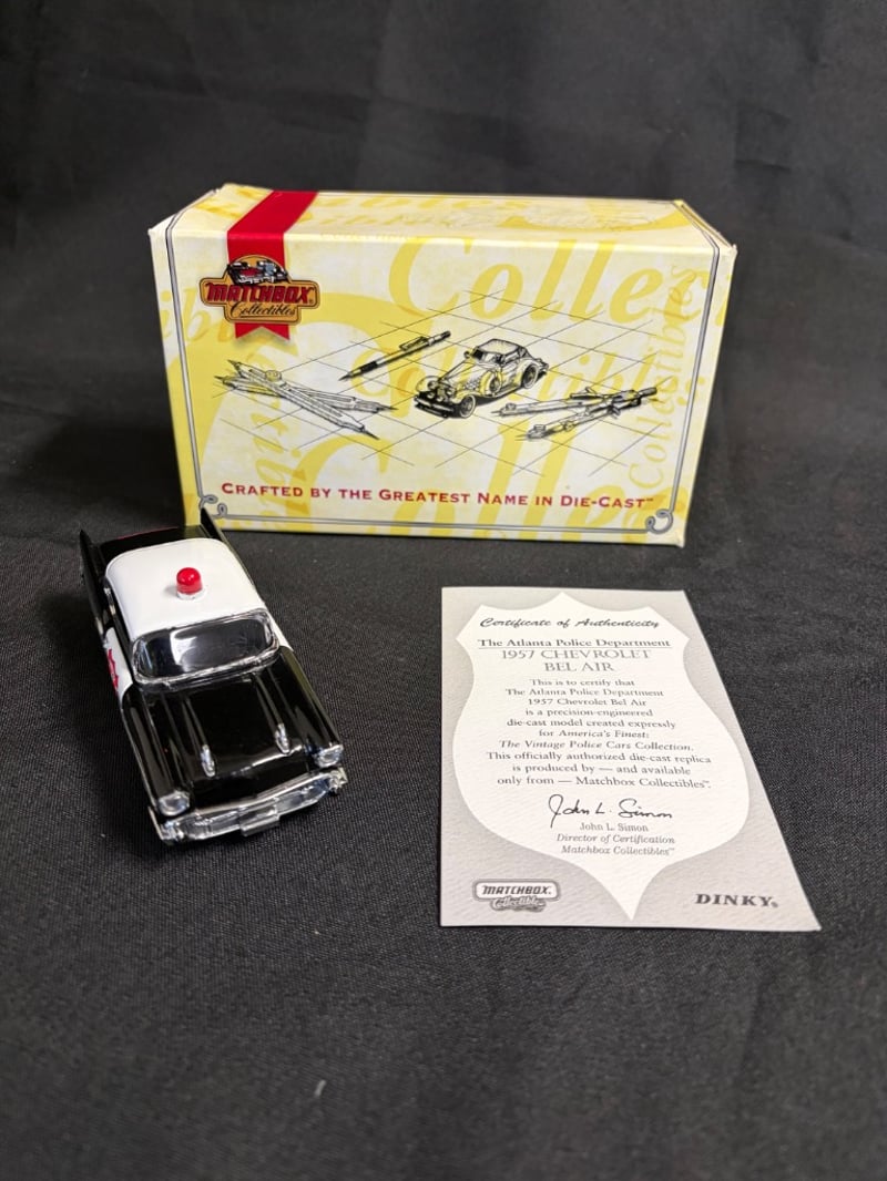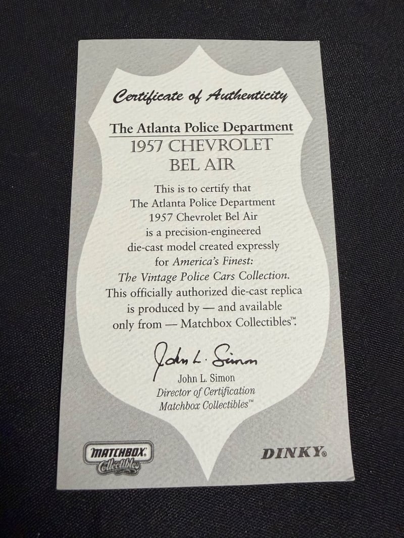 MATCHBOX COLLECTIBLES 1957 CHEVROLET BEL AIR ATLANTA POLICE DEPARTMENT DIE-CAST MODEL WITH CERTIFICATE OF AUTHENTICITY Item Size: Height: 5cm, Width: 3cm, Depth: 18cm, Weight: 0.5Kg Condition: Good - Refer To Images 584552+23