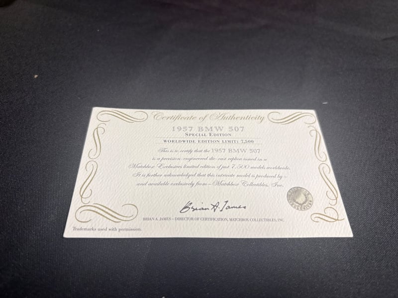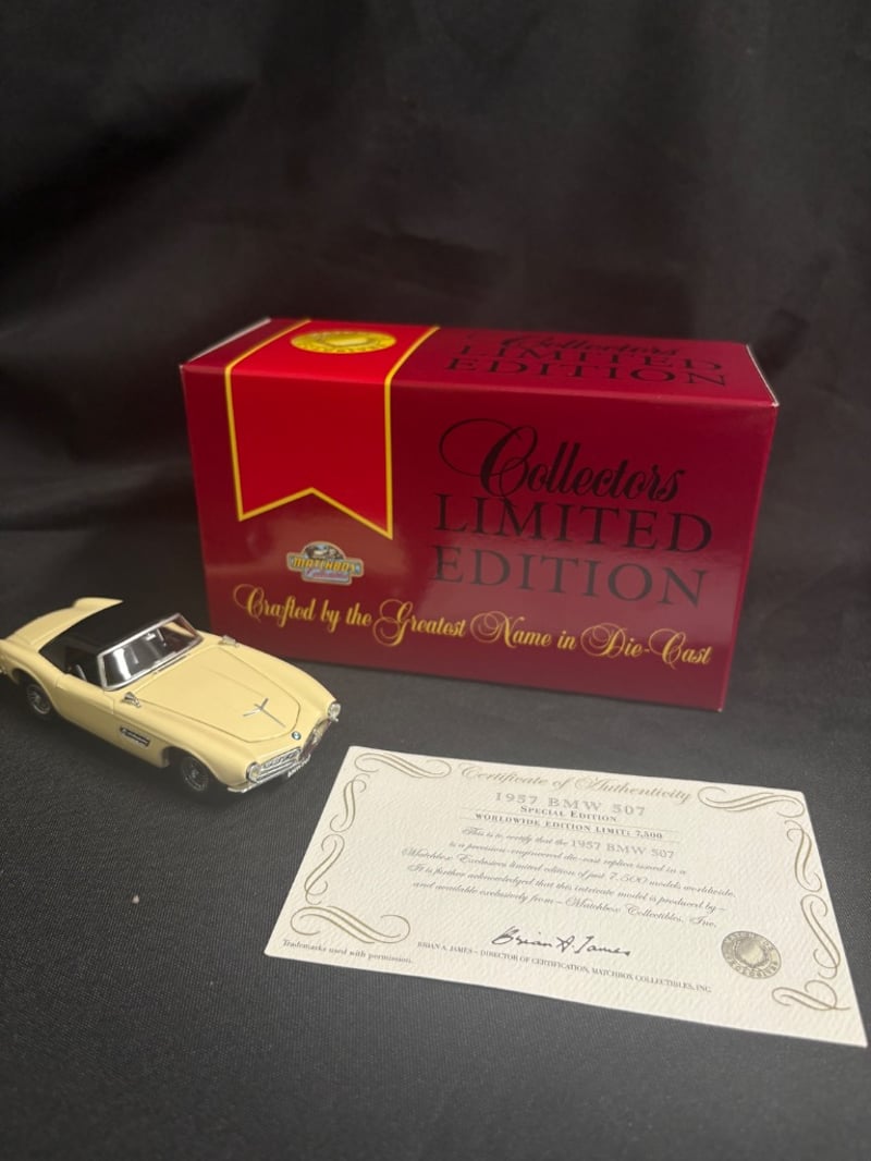 MATCHBOX COLLECTORS LIMITED EDITION 1957 BMW 507 DIE-CAST MODEL WITH CERTIFICATE OF AUTHENTICITY Item Size: Height: 5cm, Width: 3cm, Depth: 10cm, Weight: 0.5Kg Matchbox Collectors Limited Edition Die-Cast Model Of A 1957 Bmw 507 In Cream/Pale Yellow Finish. Condition: Good - Refer To Images 584552+31