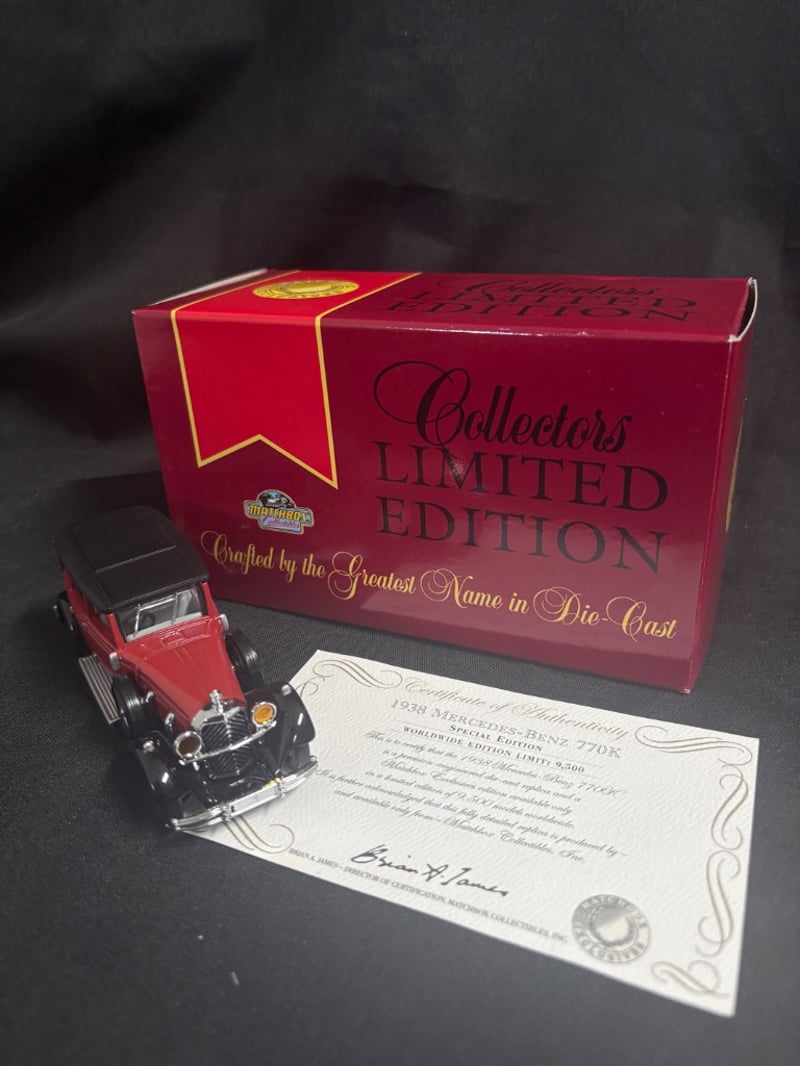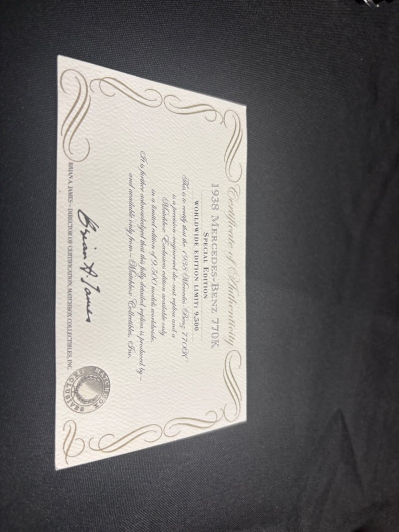 1938 MERCEDES-BENZ 770K COLLECTORS LIMITED EDITION DIE-CAST MODEL BY MATCHBOX WITH CERTIFICATE OF AUTHENTICITY Item Size: Height: 5cm, Width: 3cm, Depth: 10cm, Weight: 0.5Kg Condition: Good - Refer To Images 584552+32