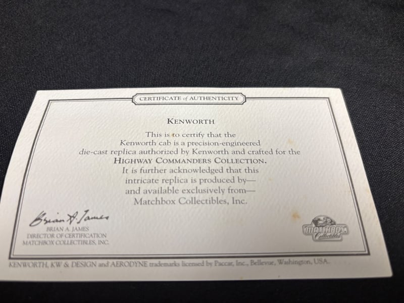 MATCHBOX COLLECTIBLES KENWORTH HIGHWAY COMMANDERS DIE-CAST TRUCK WITH CERTIFICATE OF AUTHENTICITY Item Size: Height: 5cm, Width: 3cm, Depth: 10cm, Weight: 0.5Kg Condition: Good - Refer To Images 584552+42