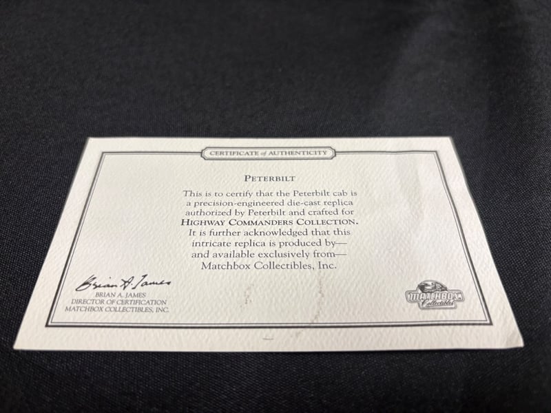 PETERBILT CAB DIE-CAST MODEL TRUCK - HIGHWAY COMMANDERS COLLECTION WITH CERTIFICATE OF AUTHENTICITY Item Size: Height: 5cm, Width: 3cm, Depth: 10cm, Weight: 0.5Kg Condition: Good - Refer To Images 584552+43