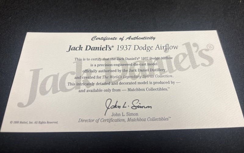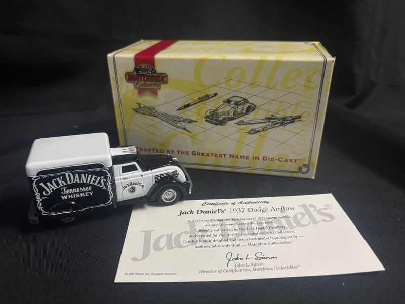 MATCHBOX COLLECTIBLES JACK DANIEL'S 1937 DODGE AIRFLOW DIE-CAST MODEL WITH CERTIFICATE OF AUTHENTICITY Item Size: Height: 5cm, Width: 3cm, Depth: 10cm, Weight: 0.5Kg Precision-Engineered Die-Cast Model Of A 1937 Dodge Airflow Featuring Authentic Jack Daniel'S Tennessee Whiskey Livery. Condition: Good - Refer To Images 584552+46