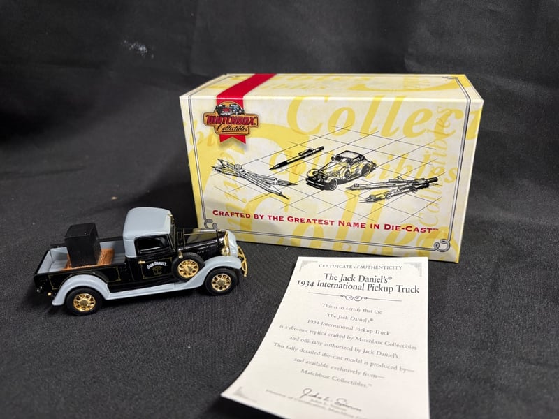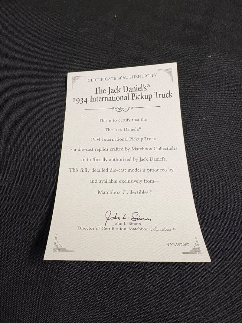 MATCHBOX COLLECTIBLES JACK DANIEL'S 1934 INTERNATIONAL PICKUP TRUCK DIE-CAST MODEL WITH CERTIFICATE OF AUTHENTICITY Item Size: Height: 5cm, Width: 3cm, Depth: 10cm, Weight: 0.5Kg Condition: Good - Refer To Images 584552+48