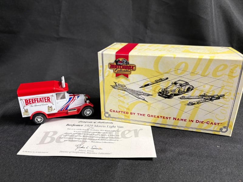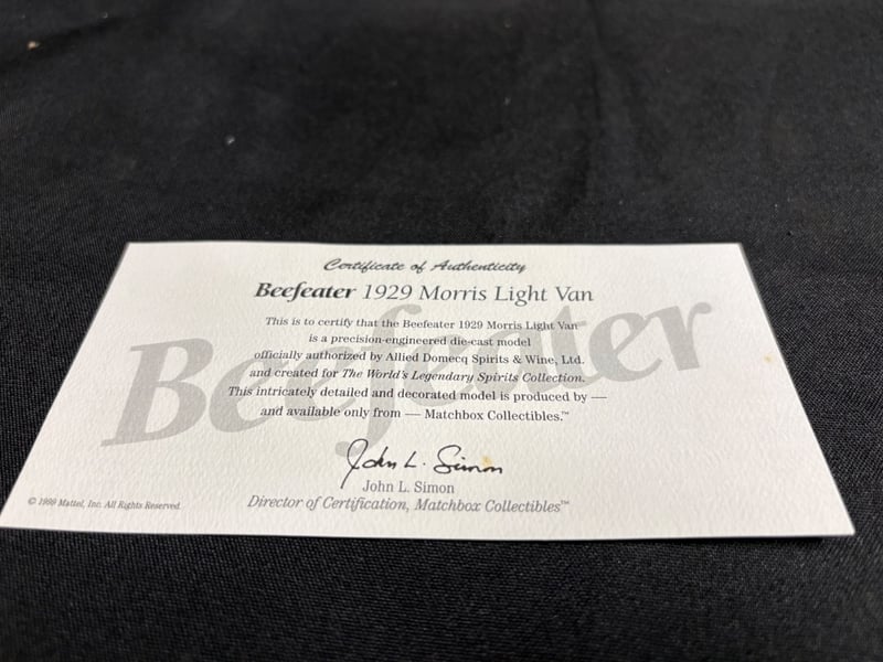 BEEFEATER 1929 MORRIS LIGHT VAN DIE-CAST MODEL WITH CERTIFICATE OF AUTHENTICITY Item Size: Height: 5cm, Width: 3cm, Depth: 10cm, Weight: 0.5Kg Condition: Good - Refer To Images 584552+49