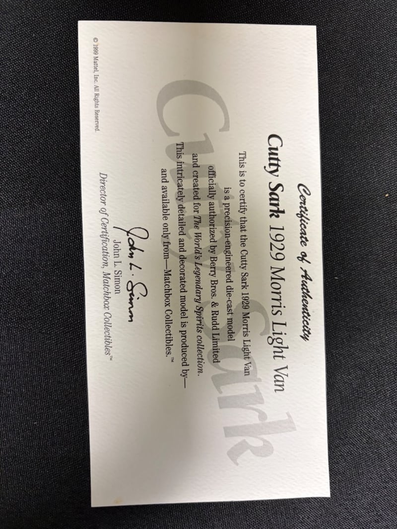 MATCHBOX COLLECTIBLES CUTTY SARK 1929 MORRIS LIGHT VAN WITH CERTIFICATE OF AUTHENTICITY Item Size: Height: 5cm, Width: 3cm, Depth: 10cm, Weight: 0.5Kg Condition: Good - Refer To Images 584552+52