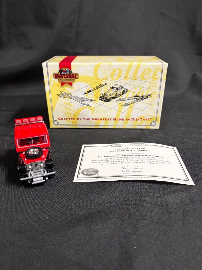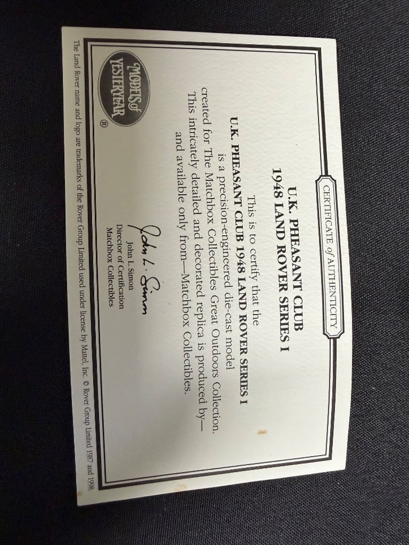MATCHBOX YESTERYEAR U.K. PHEASANT CLUB 1948 LAND ROVER SERIES 1 DIE-CAST MODEL WITH CERTIFICATE OF AUTHENTICITY Item Size: Height: 5cm, Width: 3cm, Depth: 10cm, Weight: 0.5Kg Condition: Good - Refer To Images 584552+53