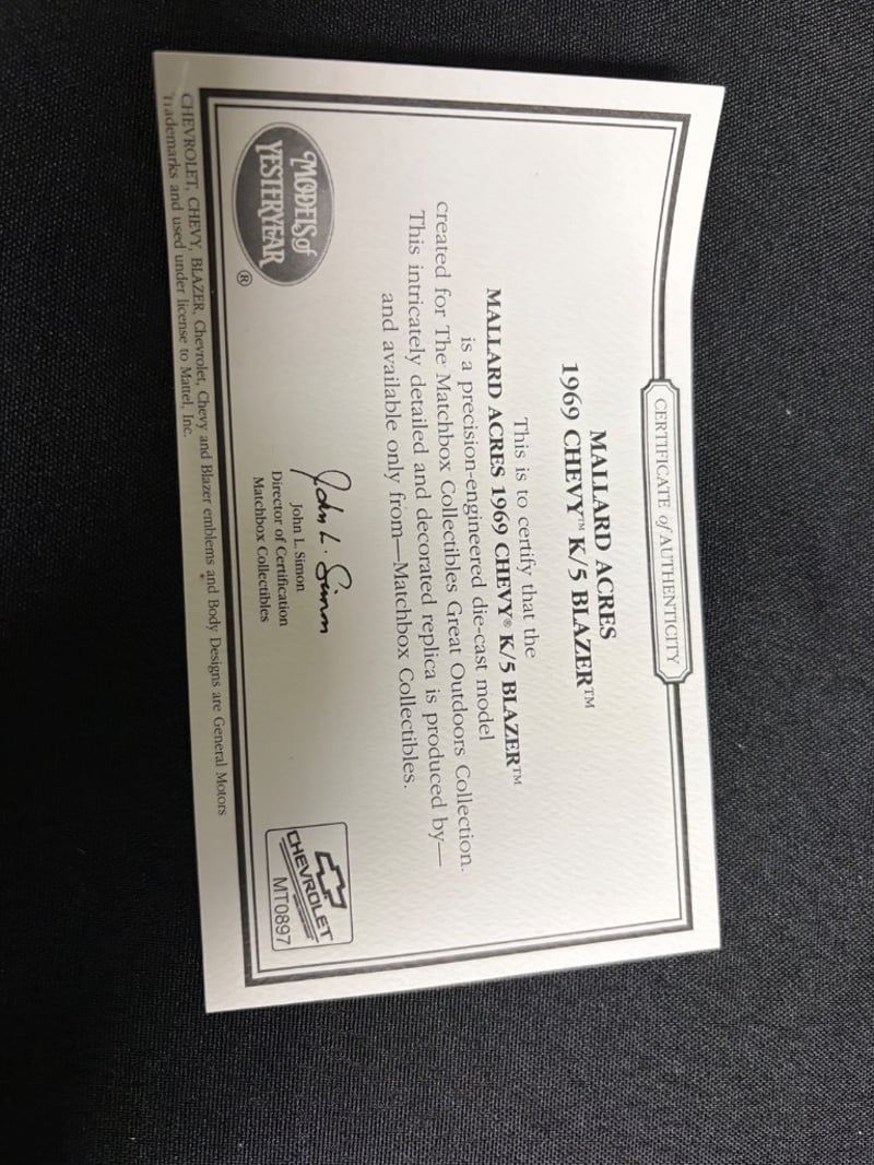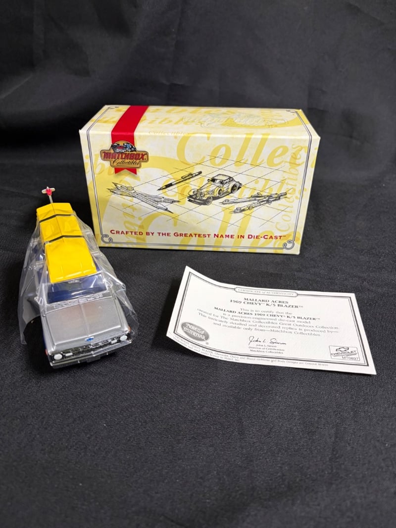 MATCHBOX COLLECTIBLES 1969 CHEVROLET K5 BLAZER DIE-CAST MODEL - MALLARD ACRES CHESAPEAKE BAY MARYLAND WITH CERTIFICATION OF AUTHENTICITY Item Size: Height: 5cm, Width: 3cm, Depth: 10cm, Weight: 0.5Kg Condition: Good - Refer To Images 584552+54