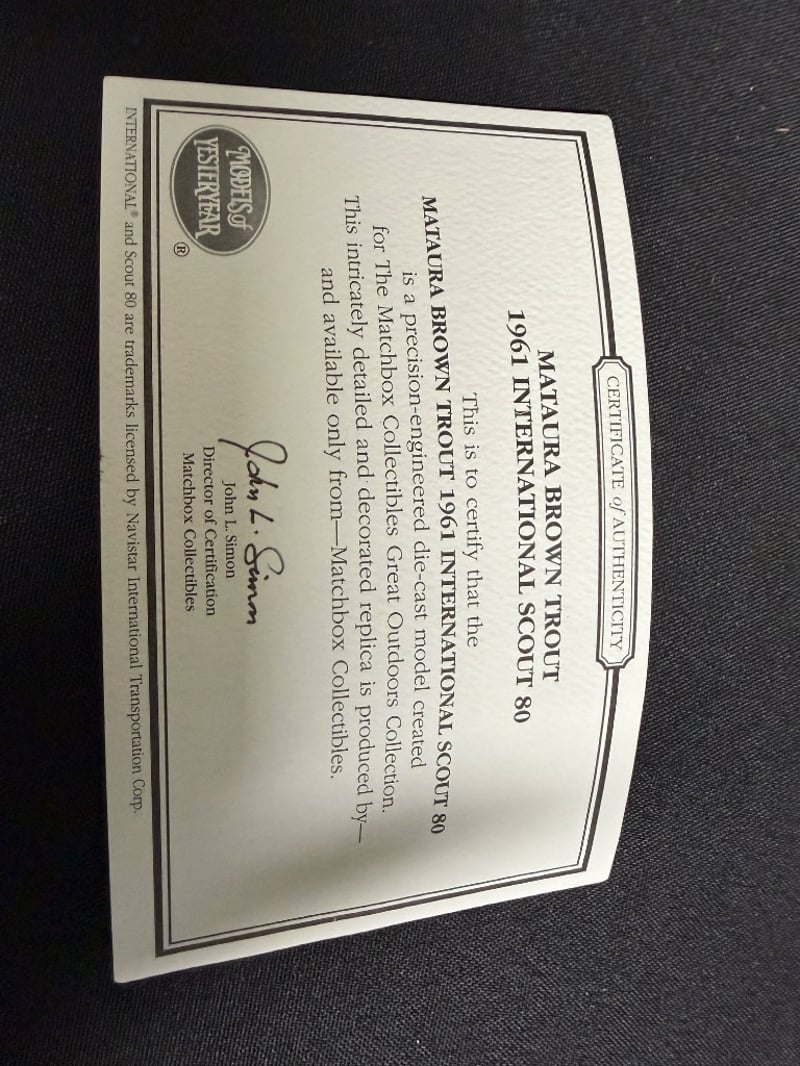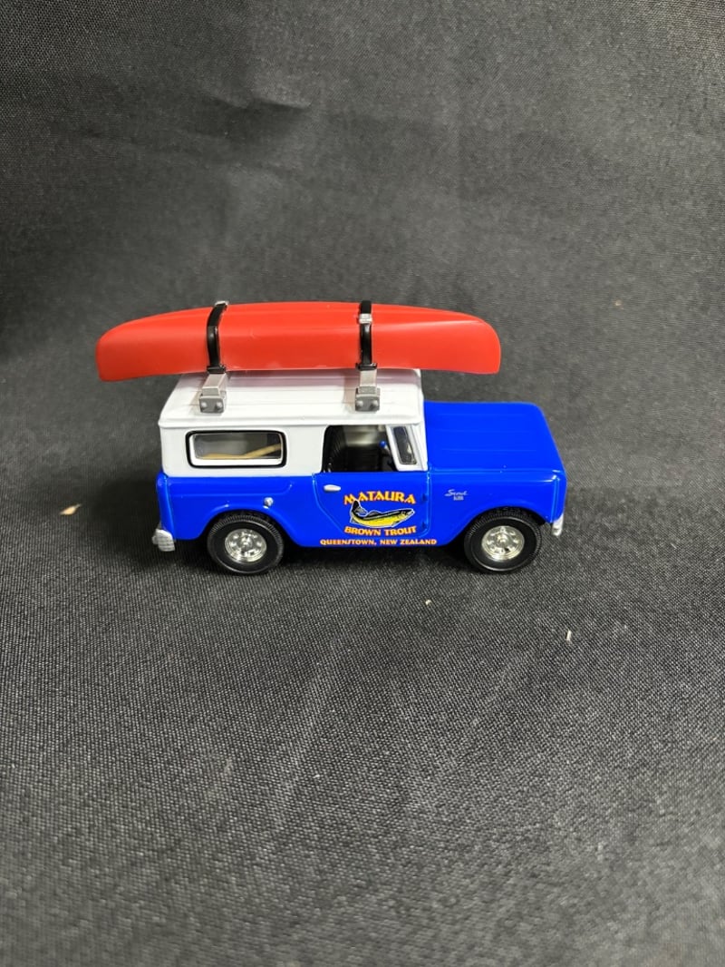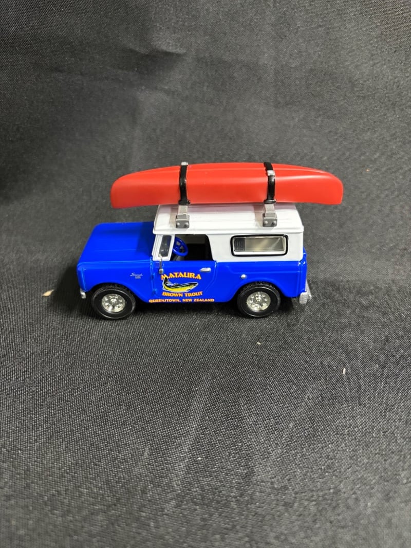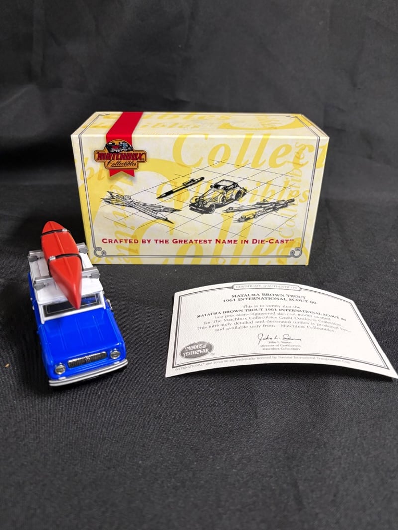 MATCHBOX COLLECTIBLES MATAURA BROWN TROUT 1961 INTERNATIONAL SCOUT 80 DIE-CAST MODEL WITH KAYAK WITH CERTIFICATE OF AUTHENTICATION Item Size: Height: 5cm, Width: 3cm, Depth: 10cm, Weight: 0.5Kg Condition: Good - Refer To Images 584552+55