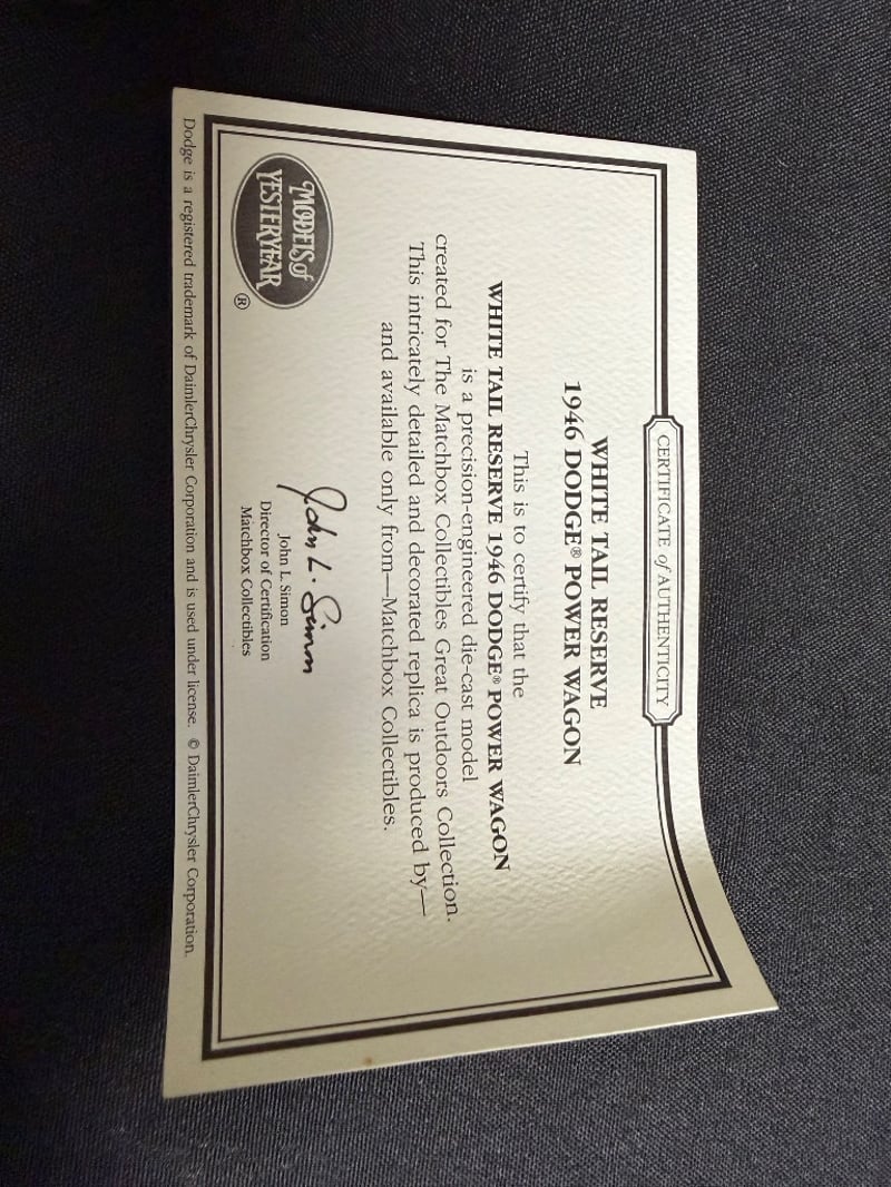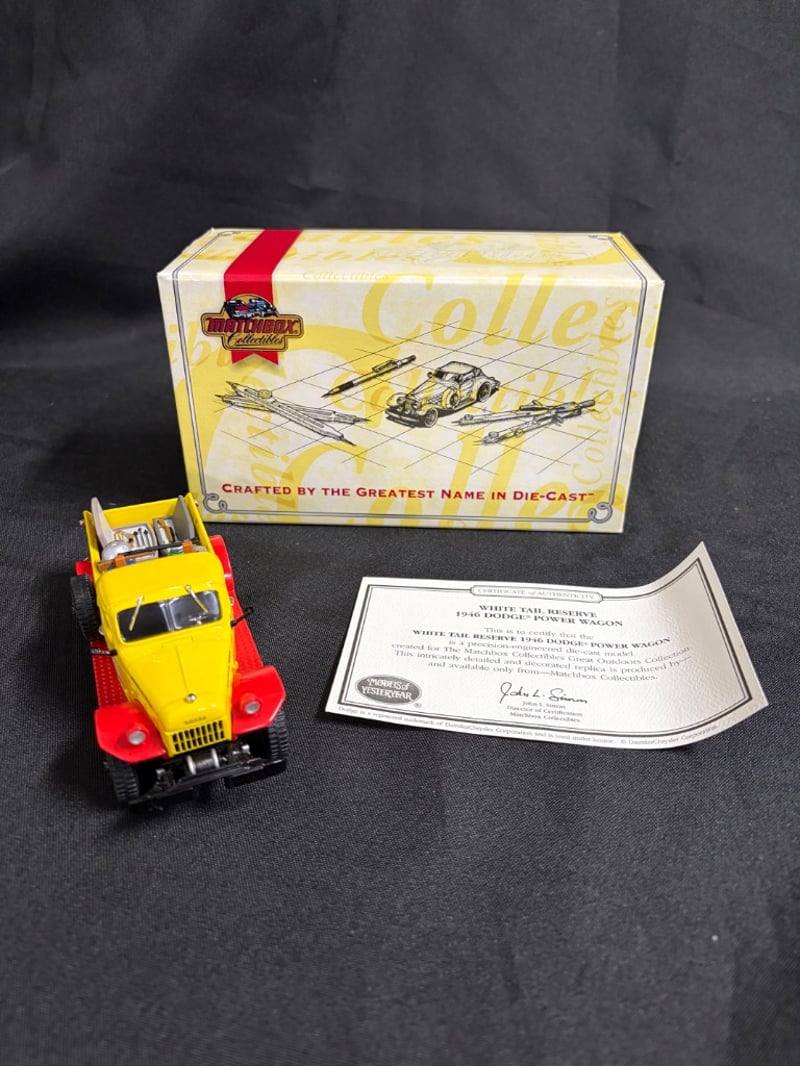 MATCHBOX COLLECTIBLES 1946 DODGE POWER WAGON DIE-CAST MODEL WITH ORIGINAL BOX AND CERTIFICATE OF AUTHENTICATION Item Size: Height: 5cm, Width: 3cm, Depth: 10cm, Weight: 0.5Kg Condition: Good - Refer To Images 584552+57