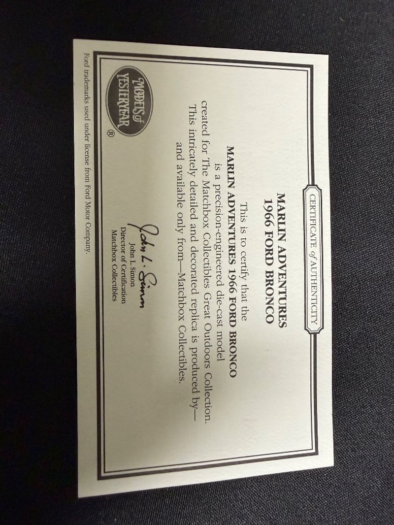 MATCHBOX COLLECTIBLES 1966 FORD BRONCO DIE-CAST MODEL WITH ORIGINAL BOX AND CERTIFICATE OF AUTHENTICATION Item Size: Height: 5cm, Width: 3cm, Depth: 10cm, Weight: 0.5Kg Condition: Good - Refer To Images 584552+58