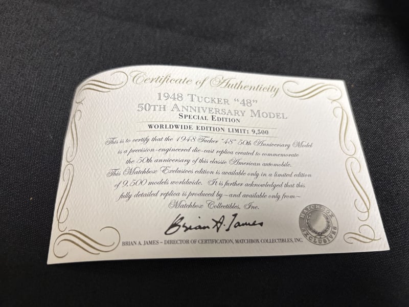 MATCHBOX COLLECTORS LIMITED EDITION 1948 TUCKER "48" 50TH ANNIVERSARY MODEL DIE-CAST VEHICLE WITH CERTIFICATE OF AUTHENTICITY Item Size: Height: 5cm, Width: 3cm, Depth: 10cm, Weight: 0.5Kg Condition: Good - Refer To Images 584552+62
