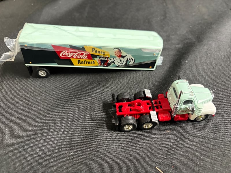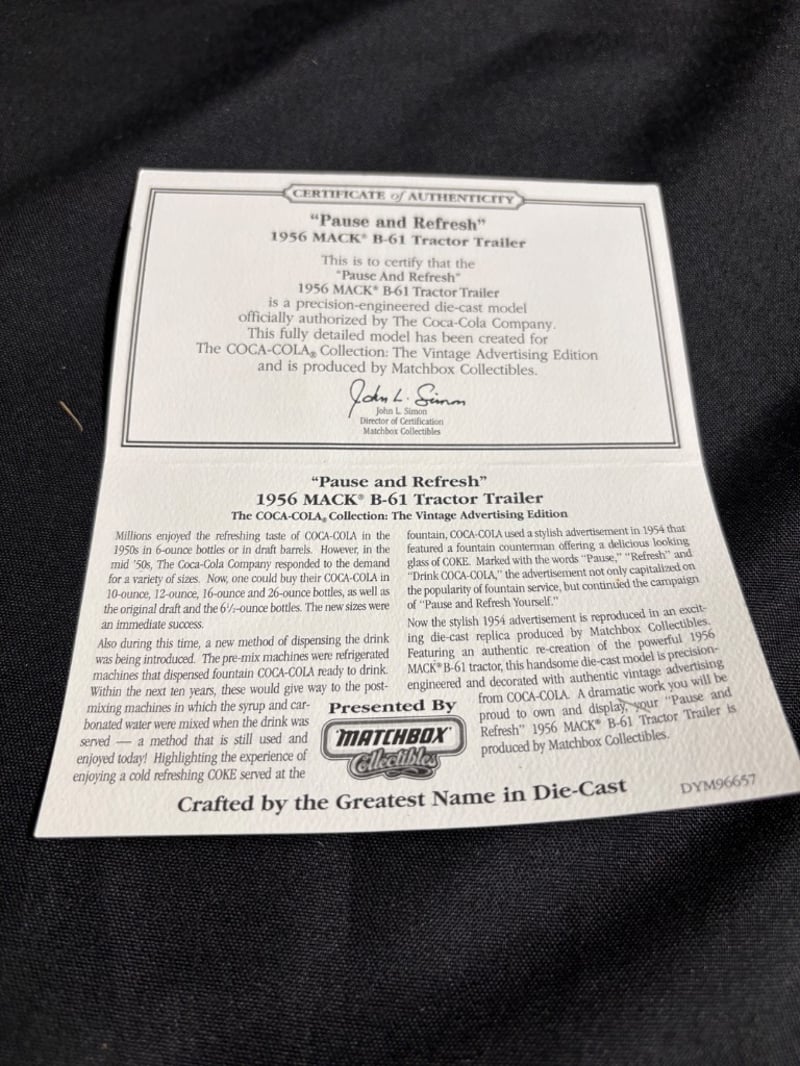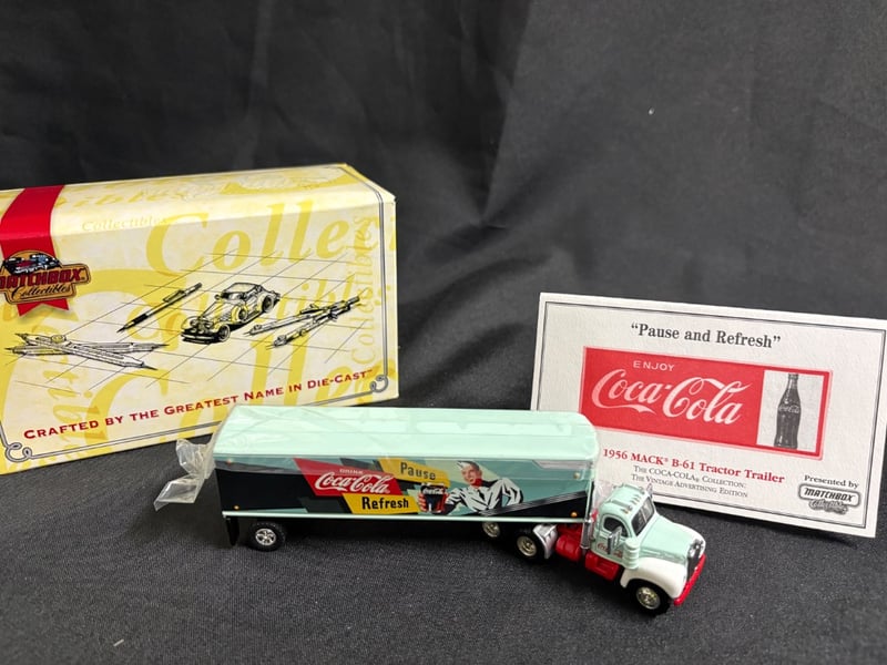 MATCHBOX COLLECTIBLES 1956 MACK B-61 TRACTOR TRAILER "PAUSE AND REFRESH" COCA-COLA DIE-CAST MODEL WITH ORIGINAL BOX AND CERTIFICATE OF AUTHENTICITY Item Size: Height: 5cm, Width: 3cm, Depth: 10cm, Weight: 1Kg Condition: Good - Refer To Images 584552+66