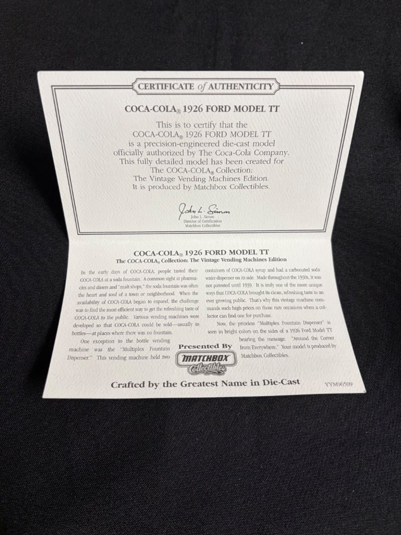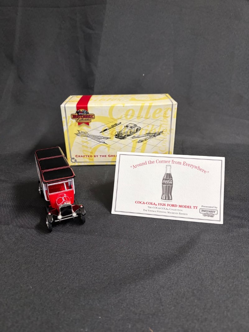 MATCHBOX COLLECTIBLES COCA-COLA 1926 FORD MODEL TT DIE-CAST VEHICLE SET WITH CERTIFICATE OF AUTHENTICATION Item Size: Height: 5cm, Width: 3cm, Depth: 10cm, Weight: 0.5Kg Condition: Good - Refer To Images 584552+67