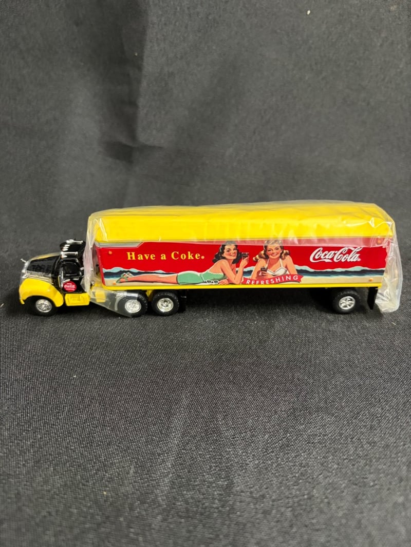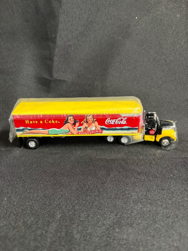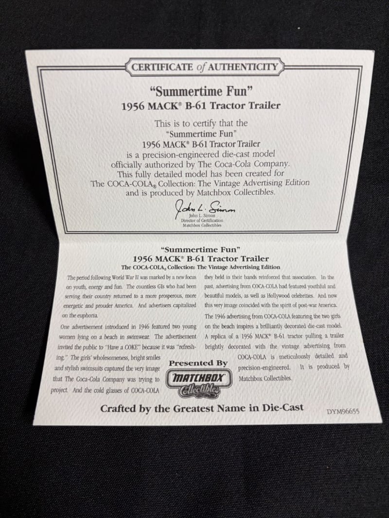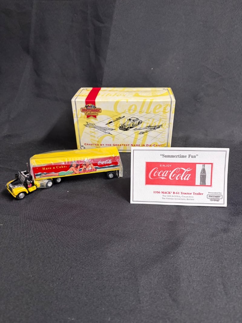 MATCHBOX COLLECTIBLES 1956 MACK B-61 TRACTOR TRAILER "SUMMERTIME FUN" COCA-COLA DIE-CAST MODEL WITH CERTIFICATE OF AUTHENTICITY Item Size: Height: 5cm, Width: 3cm, Depth: 16cm, Weight: 0.5Kg Condition: Good - Refer To Images 584552+68