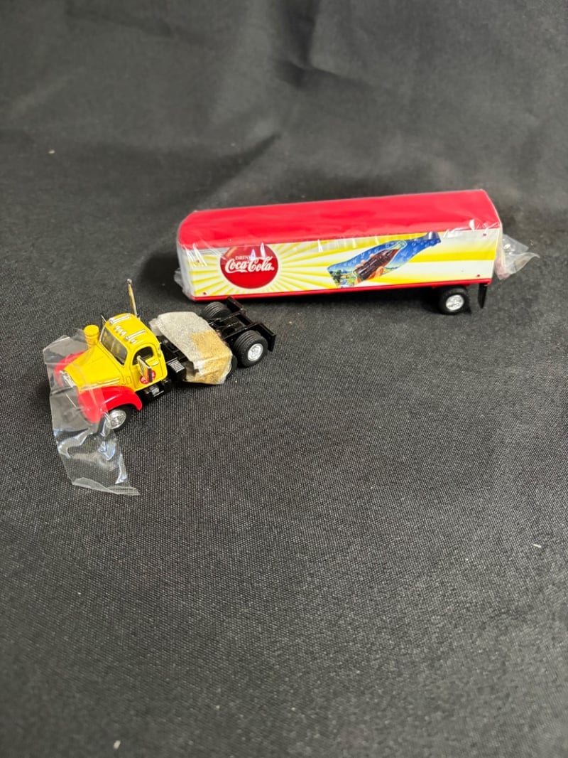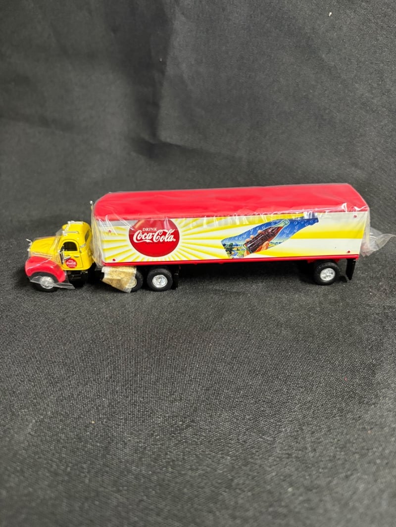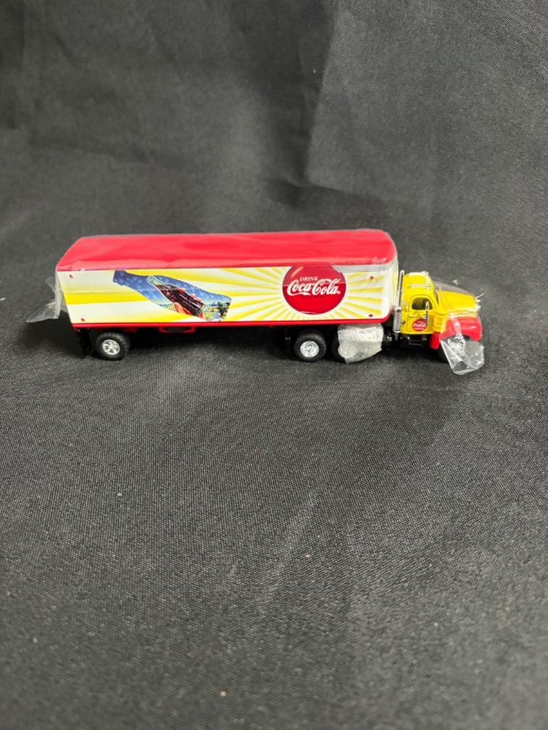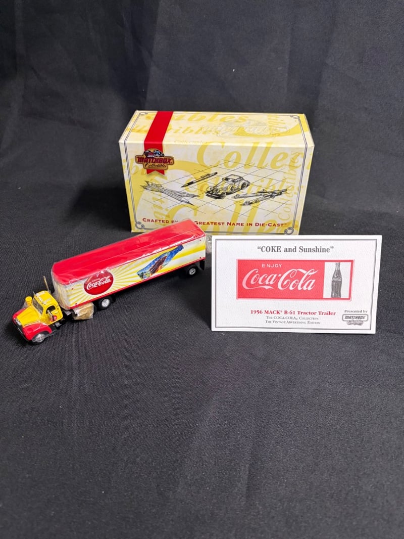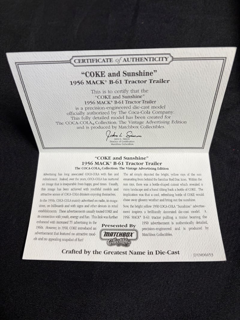 MATCHBOX COLLECTIBLES "COKE AND SUNSHINE" 1956 MACK B-61 TRACTOR TRAILER DIE-CAST MODEL WITH CERTIFICATE OF AUTHENTICITY Item Size: Height: 5cm, Width: 3cm, Depth: 16cm, Weight: 0.5Kg Condition: Good - Refer To Images 584552+79
