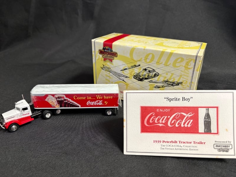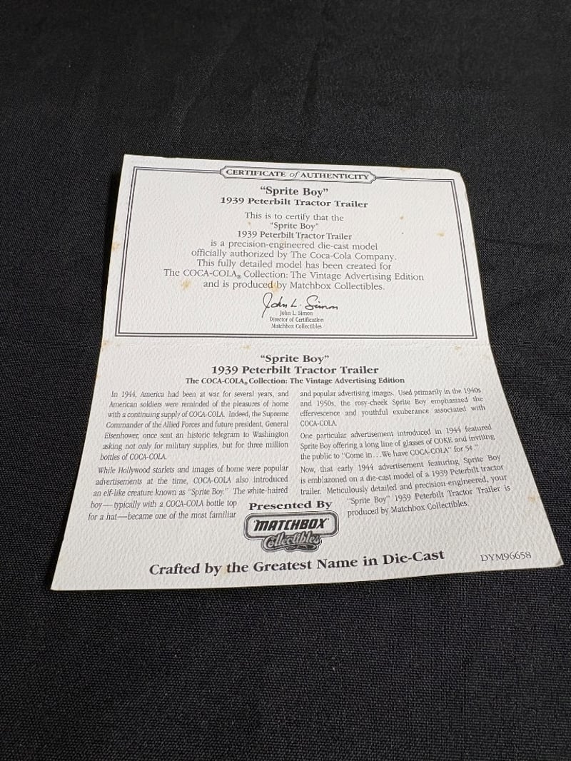 MATCHBOX COLLECTIBLES "SPRITE BOY" 1939 PETERBILT TRACTOR TRAILER - COCA-COLA VINTAGE ADVERTISING EDITION WITH CERTIFICATE OF AUTHENTICITY Item Size: Height: 5cm, Width: 3cm, Depth: 16cm, Weight: 0.5Kg Condition: Good - Refer To Images 584552+81