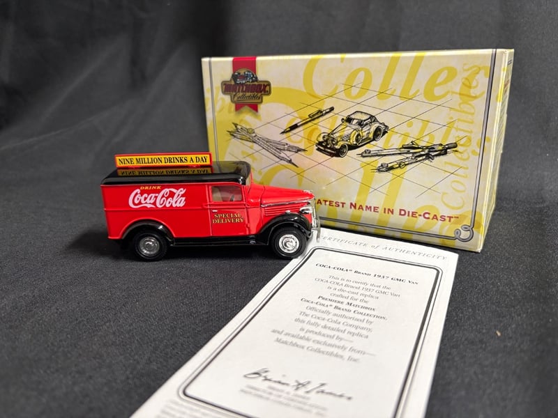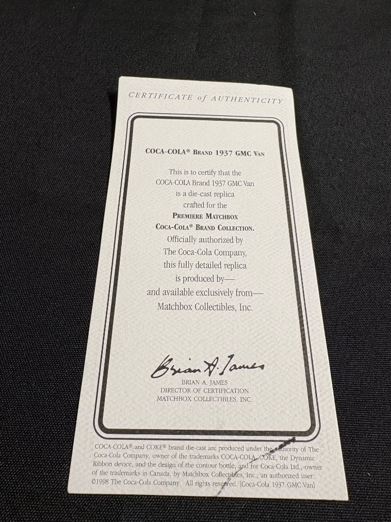 MATCHBOX COLLECTIBLES COCA-COLA 1937 GMC VAN DIE-CAST MODEL WITH CERTIFICATE OF AUTHENTICITY Item Size: Height: 5cm, Width: 3cm, Depth: 10cm, Weight: 0.5Kg Condition: Good - Refer To Images 584552+86