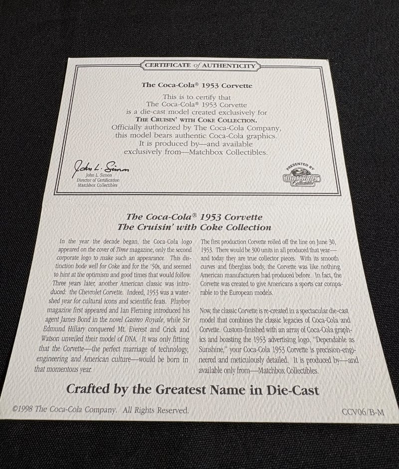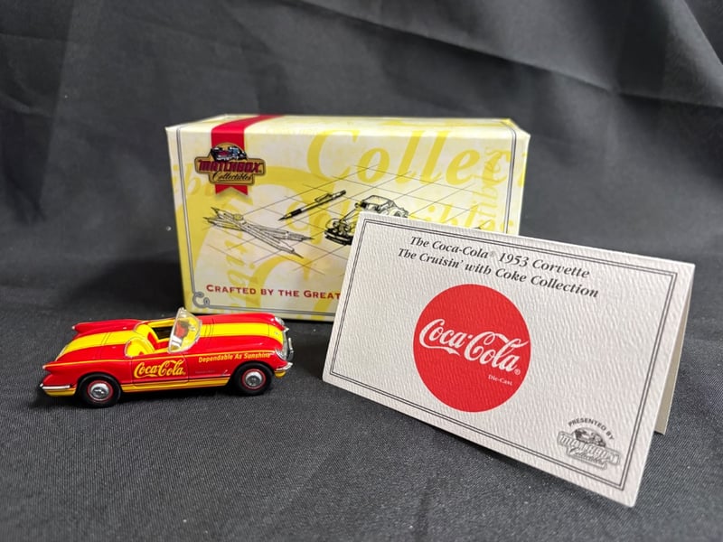 MATCHBOX COLLECTIBLES COCA-COLA 1953 CORVETTE DIE-CAST MODEL WITH CERTIFICATE OF AUTHENTICITY Item Size: Height: 5cm, Width: 3cm, Depth: 10cm, Weight: 0.5Kg Condition: Good - Refer To Images 584552+87