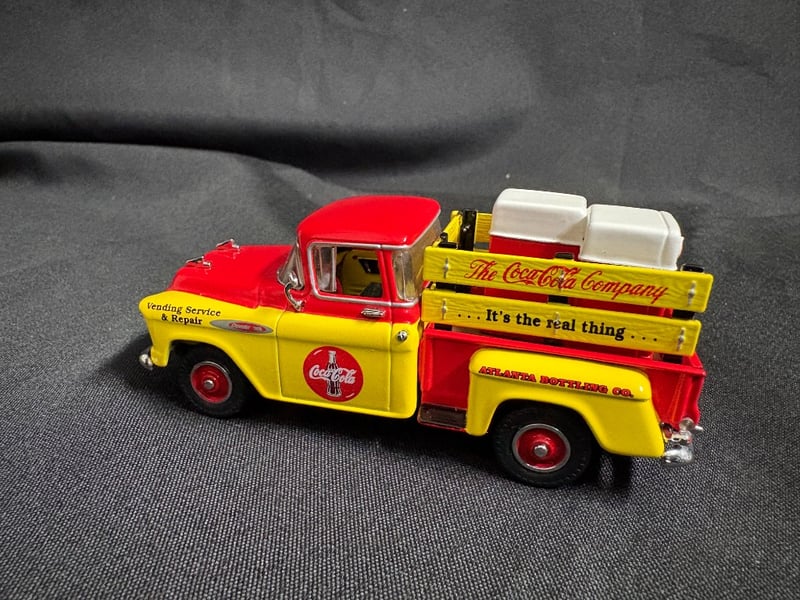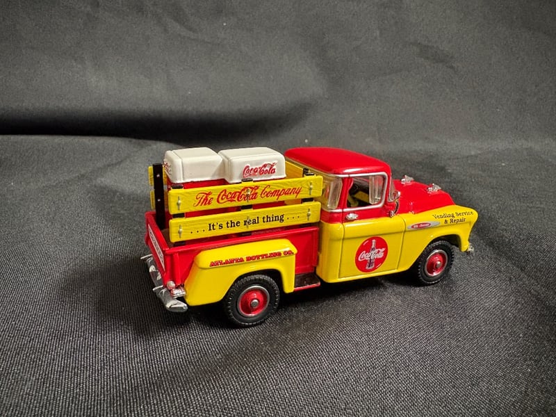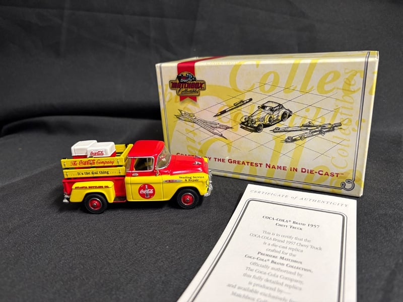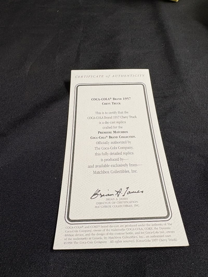 MATCHBOX COLLECTIBLES COCA-COLA BRAND 1957 CHEVY TRUCK DIE-CAST MODEL WITH CERTIFICATE OF AUTHENTICITY Item Size: Height: 5cm, Width: 3cm, Depth: 10cm, Weight: 0.5Kg Condition: Good - Refer To Images 584552+89