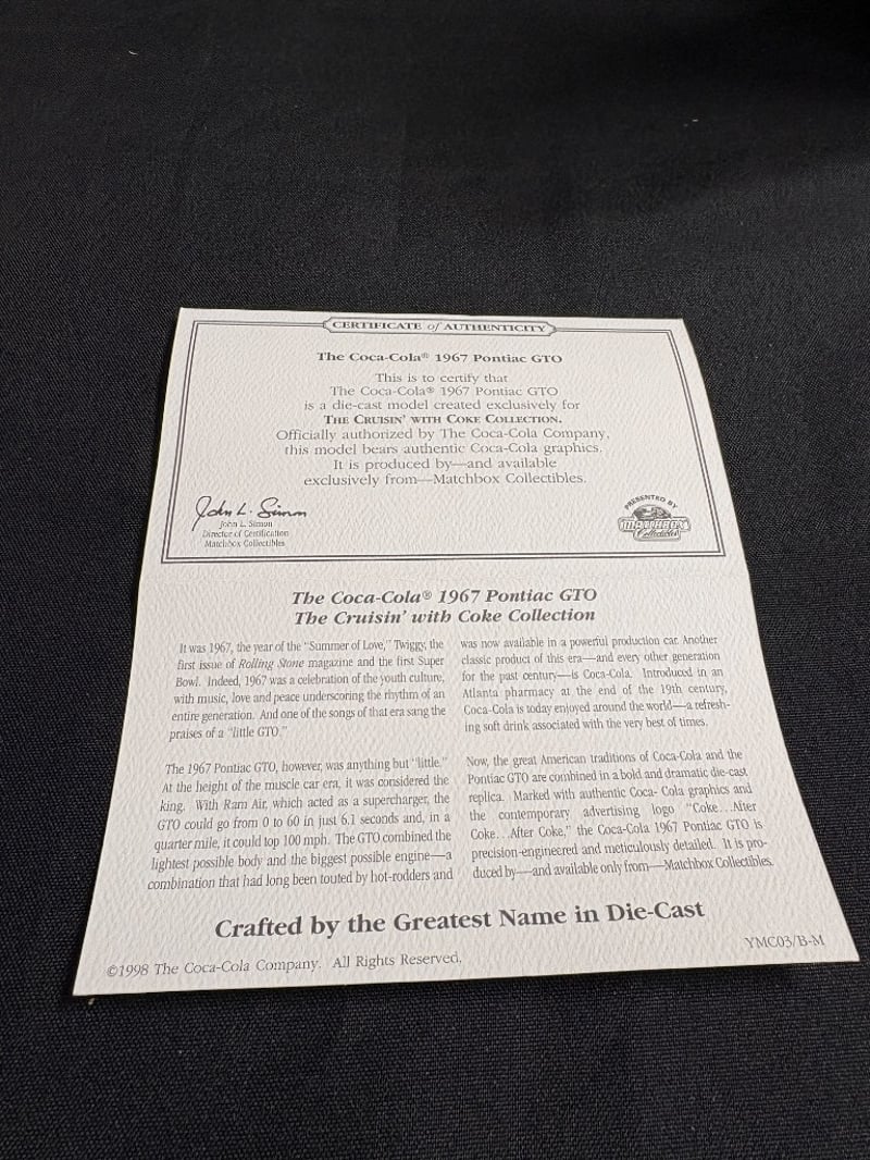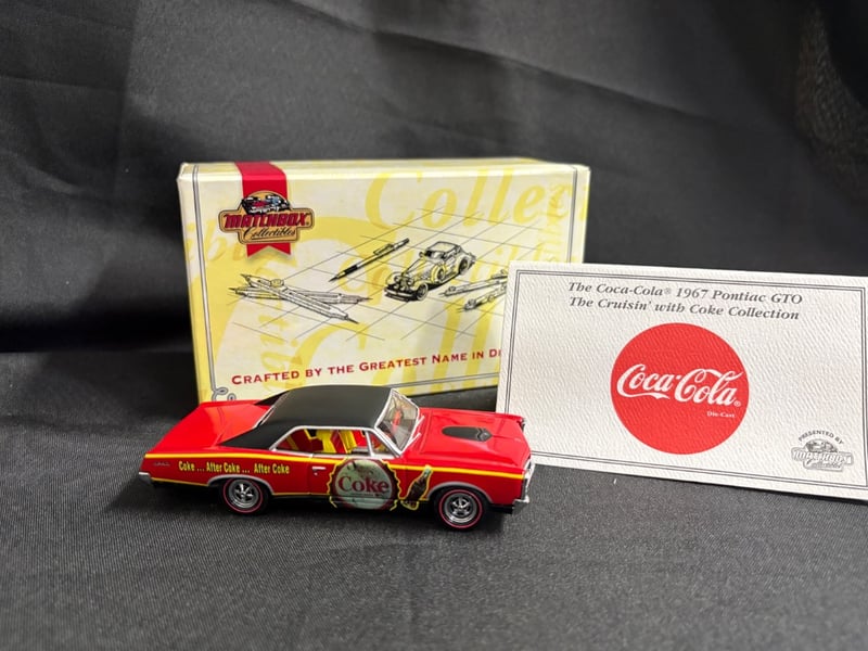 MATCHBOX COLLECTIBLES 1967 COCA-COLA PONTIAC GTO DIE-CAST MODEL - "THE CRUISIN' WITH COKE COLLECTION" WITH CERTIFICATE OF AUTHENTICITY Item Size: Height: 5cm, Width: 3cm, Depth: 10cm, Weight: 0.5Kg Condition: Good - Refer To Images 584552+90