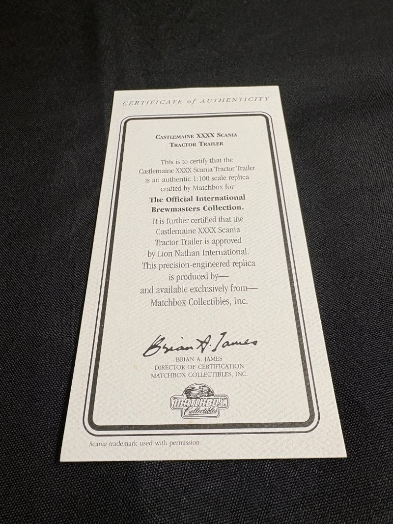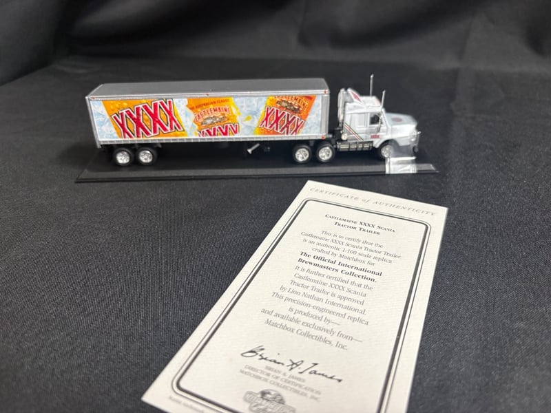 CASTLEMAINE XXXX SCANIA TRACTOR TRAILER - OFFICIAL BREWMASTERS COLLECTION WITH CERTIFICATE OF AUTHENTICITY Item Size: Height: 6cm, Width: 6cm, Depth: 20cm, Weight: 1Kg Condition: Good - Refer To Images 584552+95