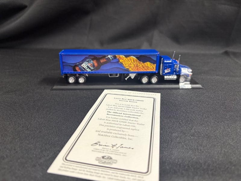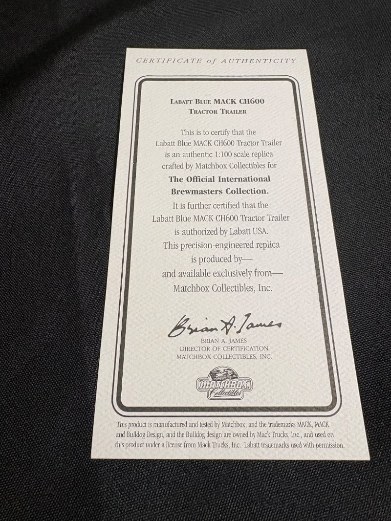 LABATT BLUE MACK CH600 TRACTOR TRAILER - MATCHBOX COLLECTIBLES WITH CERTIFICATE OF AUTHENTICITY Item Size: Height: 5cm, Width: 6cm, Depth: 18cm, Weight: 1Kg Condition: Good - Refer To Images 584552+97