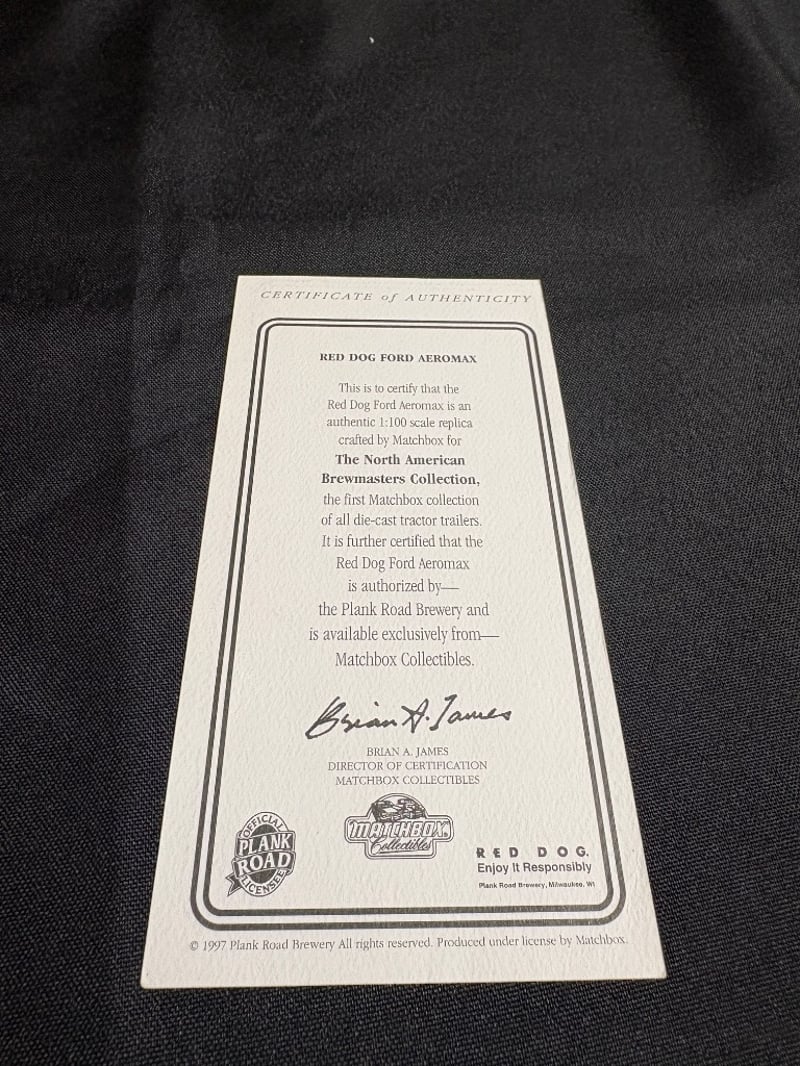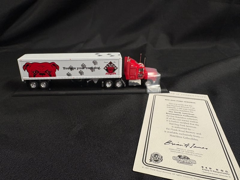 RED DOG FORD AEROMAX DIE-CAST TRUCK MODEL - NORTH AMERICAN BREWMASTERS COLLECTION WITH CERTIFICATE OF AUTHENTICITY Item Size: Height: 5cm, Width: 6cm, Depth: 20cm, Weight: 1Kg Condition: Good - Refer To Images 584552+98