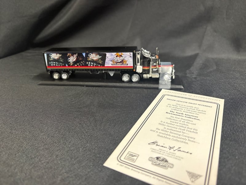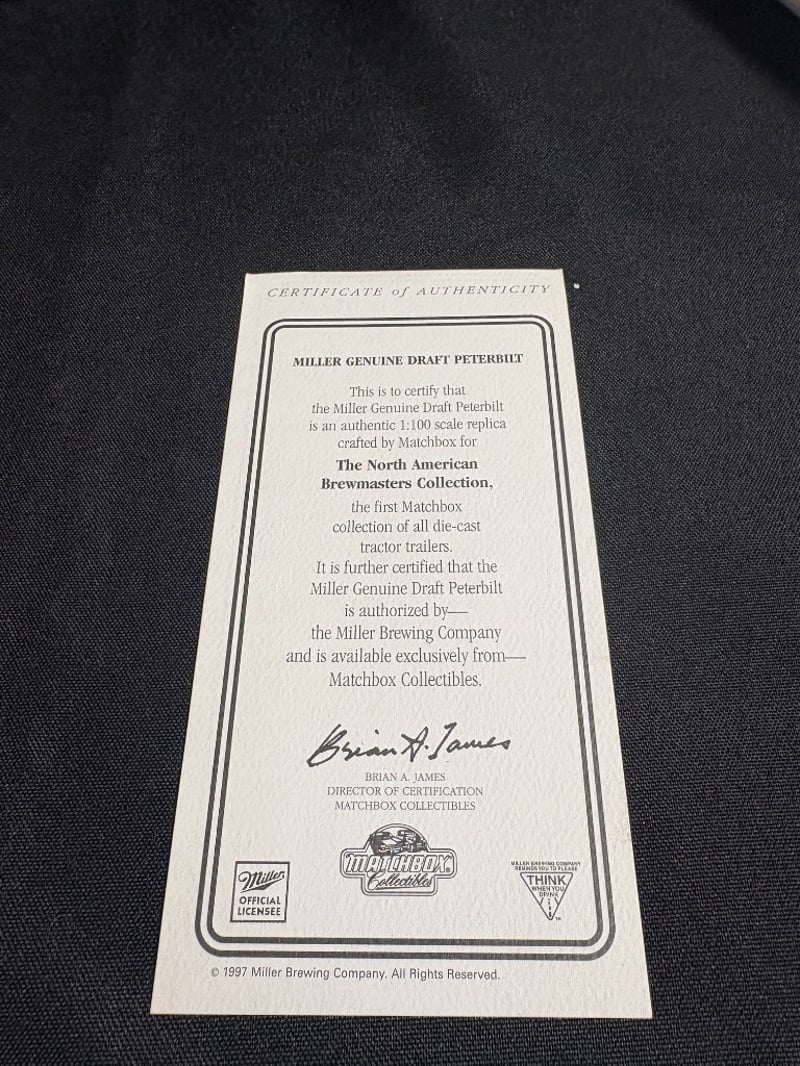 MILLER GENUINE DRAFT PETERBILT DIE-CAST TRUCK MODEL - MATCHBOX COLLECTIBLES WITH CERTIFICATE OF AUTHENTICITY Item Size: Height: 6cm, Width: 6cm, Depth: 20cm, Weight: 1Kg Condition: Good - Refer To Images 584552+100