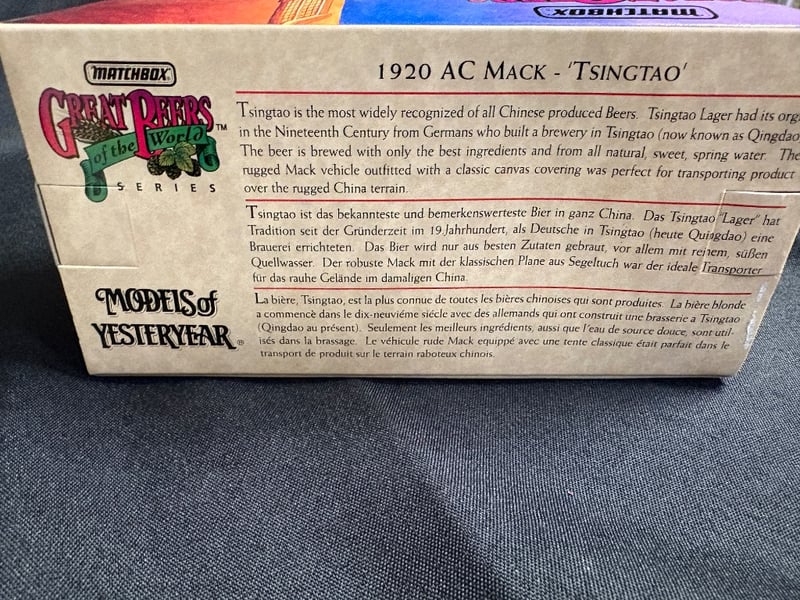 MATCHBOX MODELS OF YESTERYEAR 1920 AC MACK TSINGTAO BEER DELIVERY TRUCK Item Size: Height: 8cm, Width: 9cm, Depth: 16cm, Weight: 1Kg Condition: Good - Refer To Images 584552+122