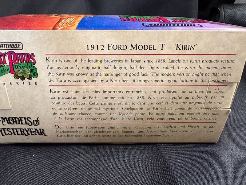 MATCHBOX MODELS OF YESTERYEAR 1912 FORD MODEL T - KIRIN BREWERY COMPANY LIMITED Item Size: Height: 8cm, Width: 9cm, Depth: 16cm, Weight: 1Kg Condition: Good - Refer To Images 584552+124