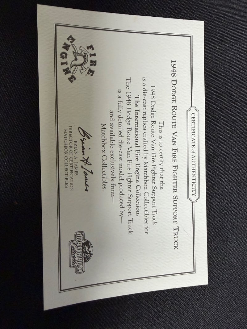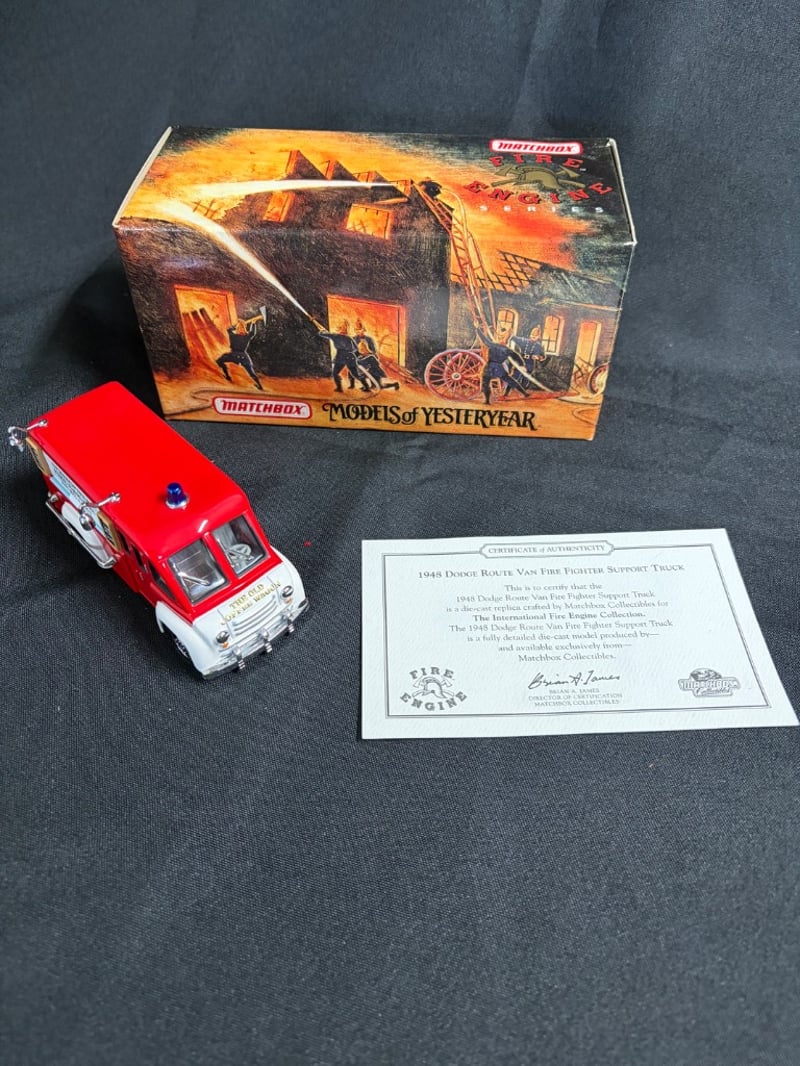 MATCHBOX MODELS OF YESTERYEAR 1948 DODGE ROUTE VAN FIRE FIGHTER SUPPORT TRUCK WITH CERTIFICATE OF AUTHENTICITY Item Size: Height: 5cm, Width: 3cm, Depth: 18cm, Weight: 0.5Kg Condition: Good - Refer To Images 584552+136