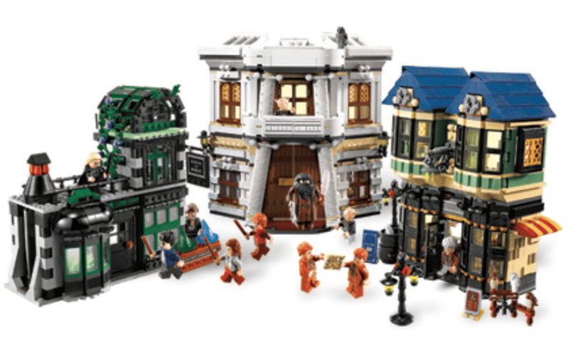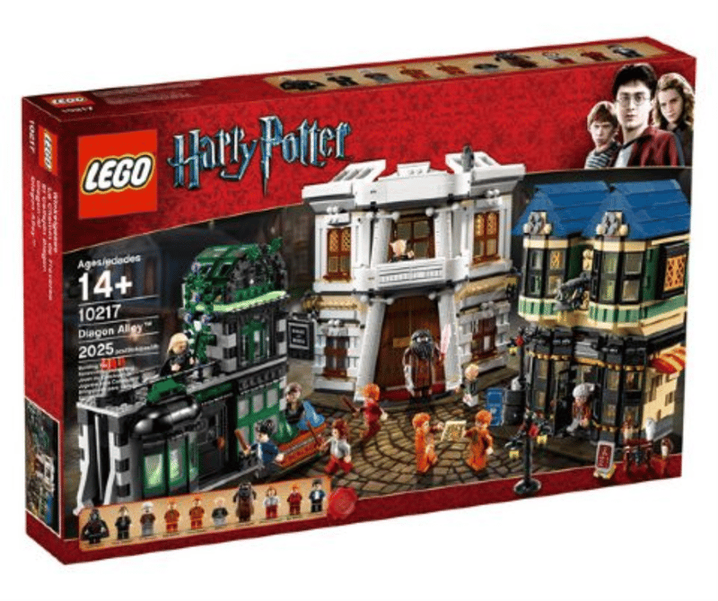 Diagon Alley From The Harry Potter Universe 2,025 Pieces Building Three Iconic Shops: Ollivander'S Wand Shop, Borgin And Burkes, And Gringotts Wizarding Bank. Twelve Minifigures Including Harry, Hagrid, Lucius Malfoy, Fenrir Greyback, And A Gringotts Goblin.