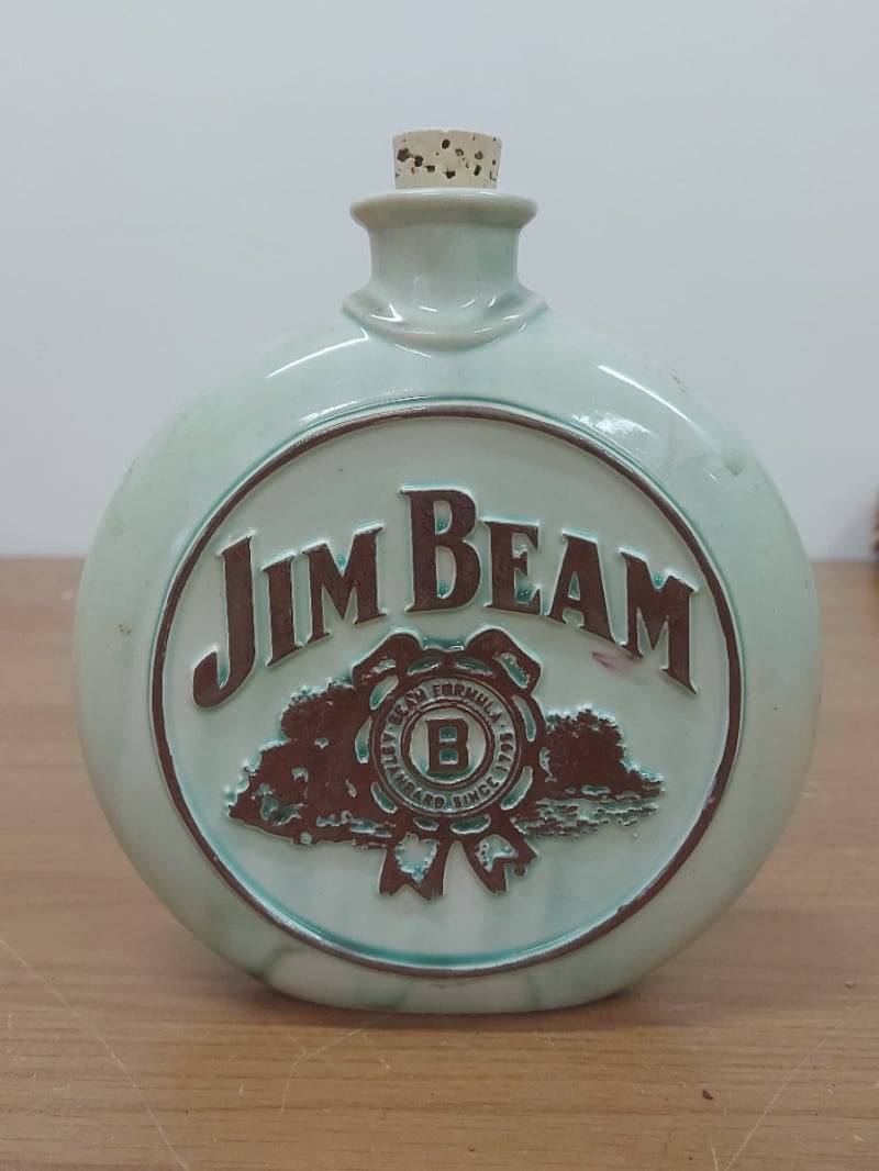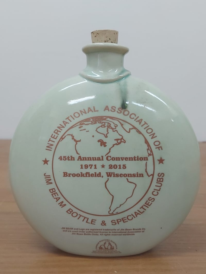 JIM BEAM CERAMIC DECANTER - INTERNATIONAL ASSOCIATION 45TH ANNUAL CONVENTION 1971-2015Item Size: Height: 20cm, Width: 15cm, Depth: 15cm, Weight: 2KgPale Celadon Ceramic Decanter Featuring Jim Beam Branding On Obverse With Kentucky Bourbon Seal And Decorative Foliage Motif.Condition: Good - Refer To Images584569+219